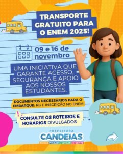 2 min read Candeias Destaque principal Prefeitura de Candeias oferece transporte gratuito para estudantes do ENEM 2025 7 de novembro de 2025 admin