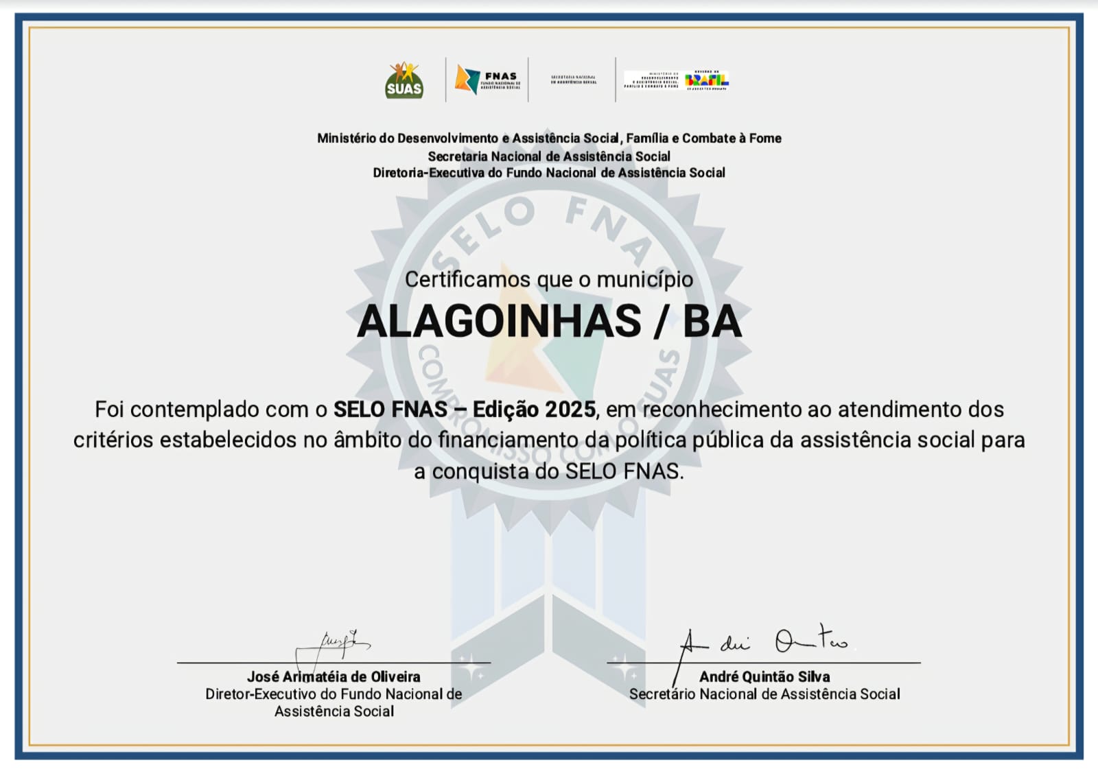 A Prefeitura de Alagoinhas conquistou o Selo FNAS – Edição 2025, uma distinção concedida pelo Fórum Nacional de Secretários Municipais de Assistência Social (FNAS). A iniciativa reconhece municípios que atendem rigorosamente aos critérios estabelecidos para o financiamento das políticas públicas de assistência social, destacando boas práticas na gestão de recursos e na oferta de serviços essenciais à população vulnerável.