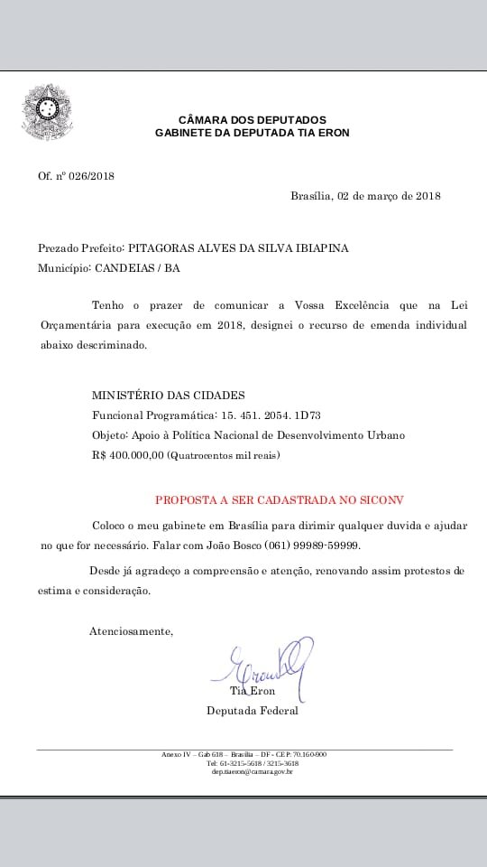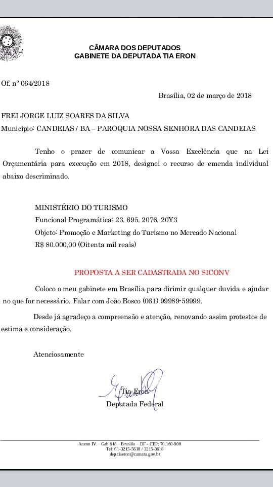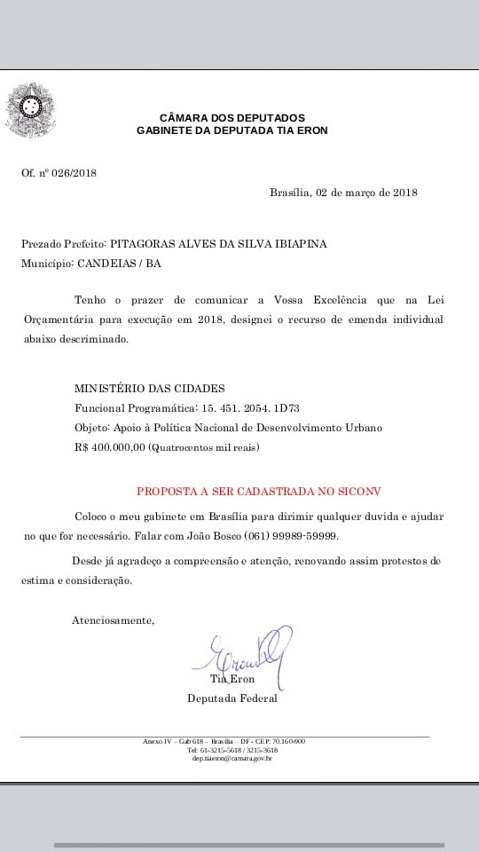 O município de Candeias foi contemplado com mais recursos de emenda. Mesmo licenciada do cargo de deputada federal, Tia Eron (PRB), destinou R$ 400 mil, para a reforma da Praça do Rio do Cunha no distrito de Passé, a pedidos do Advogado Maílson Assis, membro da Executiva Estadual do PRB , e do ex-vereador, Washington de Passé. Destinou também a pedido de Mailson Assis R$ 80 mil, através do Ministério do Turismo, para a realização do novenário em honra a Padroeira Nossa Senhora das Candeias. O evento vai acontecer de 24 de janeiro a 03 de fevereiro de 2019 Esta é mais uma ação que Tia Eron vem realizando no município. No ano passado, em visita ao distrito de Caboto, a deputada se encantou com as belezas naturais da região. Também a pedido de Maílson Assis, destinou R$ 250 mil para a requalificação da orla de Caboto. As obras já foram autorizadas. A republicana segue atenta na busca de recursos para o Estado. “Como deputada federal é meu dever ouvir as necessidades das cidades e dentro das minhas possibilidades conseguir recursos para supri-las. Mesmo atuando como secretária de uma importante pasta na capital eu tenho um compromisso firmado com o meu Estado. Por isso, a notícia dessas emendas muito me alegra. É a certeza de que todo esforço em prol da minha Bahia está conquistando resultados sólidos”, disse.