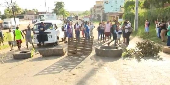 Um grupo de pessoas realiza um protesto, na manhã desta segunda-feira (22), no município de Simões Filho, região metropolitana de Salvador.