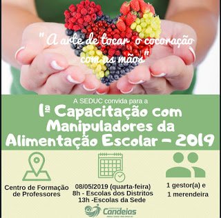 A Prefeitura de Candeias, por meio do Semae (Serviço Municipal de Alimentação Escolar), da Seduc (Secretaria Municipal da Educação), vai promover na próxima quarta-feira, 8, uma ação em favor da melhor qualidade da alimentação escolar destinada, principalmente, as Manipuladoras da Alimentação Escolar (merendeiras). A I Capacitação de 2019 destina-se àqueles que preparam, nos dias de aula, a merenda escolar para aproximadamente 12 mil alunos da rede municipal de ensino. A capacitação tem como objetivo formar merendeiras e gestores para o desenvolvimento de controle de qualidade higiênico-sanitário e implantação de operações sanitárias exigidas pelo Programa Nacional de Alimentação Escolar (PNAE). Serviço: Dia 08/05/2019 (quarta-feira) Matutino: 8h – Distrito Vespertino: 13h – Sede Local: Centro de Formação de Professores