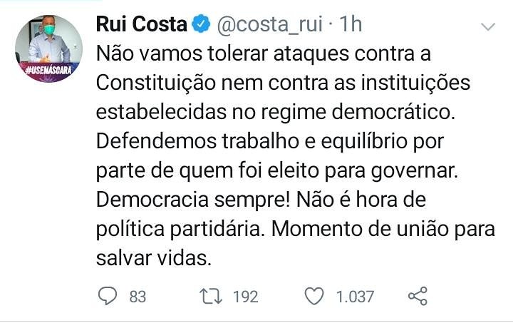 O governador da Bahia, Rui Costa, utilizou às redes sociais para repudiar o posicionamento do presidente da República, Jair Bolsonaro, que hoje participou de uma manifestação contra congresso Nacional e defesa da intervenção militar. Rui reitera que o país não pode tolerar ataques contra a constituição Federal nem contra as instituições democráticas.