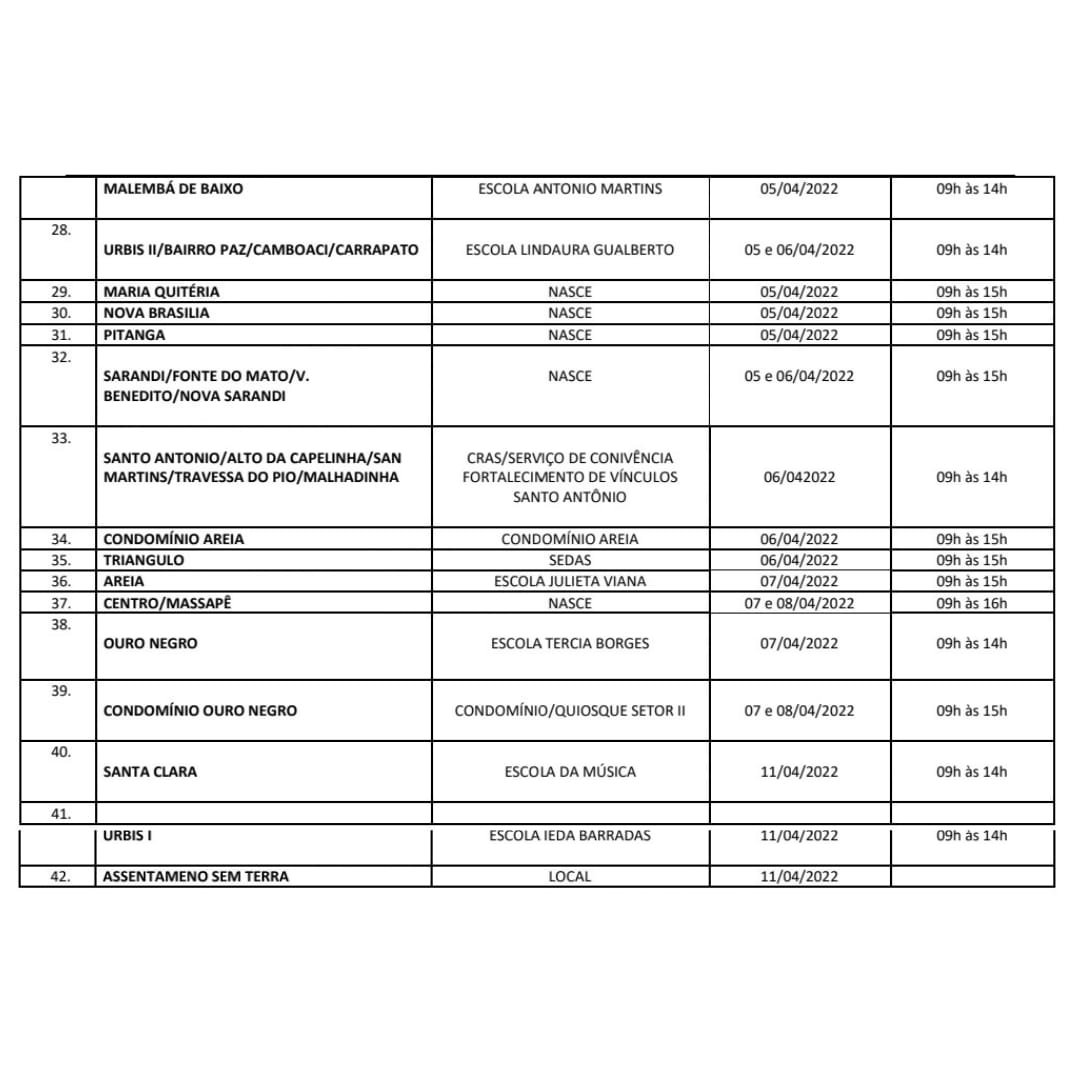 As famílias inscritas no Cadúnico, beneficiários do Bolsa Família (Auxilio Brasil) e dos Projetos Sociais vinculados a Secretaria de Desenvolvimento e Assistência Social - SEDAS da Prefeitura de Candeias. Poderão se cadastrar para o recebimento da Santa Cesta 2022, nas datas indicadas de acordo com o cronograma de distribuição dos tickets. A prefeitura proporciona às famílias uma Santa Cesta de qualidade, durante um período tão importante para todos, que é a Semana Santa. Para o prefeito, Pitágoras Ibiapina, a Santa Cesta é importante para todos os beneficiários de programas sociais. "Desde o início da nossa gestão valorizamos o cuidado com as pessoas, principalmente as mais vulneráveis, por isso, a Prefeitura por meio da Secretaria de Desenvolvimento e Assistência Social, entrega anualmente na Semana Santa uma cesta e o peixe". De acordo com Soraia Cabral, secretária da SEDAS, devido a pandemia do coronavírus muitas famílias se encontram em situação de vulnerabilidade no município, " a entrega da Santa Cesta neste período trará dignidade a mesa de muitas famílias que são acompanhadas mensalmente por meio da Secretaria", ralatou. Para a inscrição, será necessária a apresentação de documento de identificação com foto (RG ou Carteira de Trabalho) e cartão do Bolsa Família. O cadastramento começa nesta segunda-feira(28/3) em alguns distritos e bairros e seguirá até o dia 11 de abril. A SEDAS informa ainda que o ticket para retirada da Santa Cesta só será entregue ao responsável familiar, que conste na relação emitida pelo Cadúnico até 31 dezembro de 2021. Acompanhe o cronograma das datas e locais abaixo: