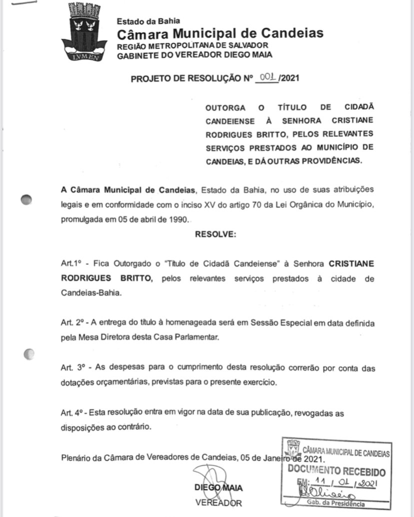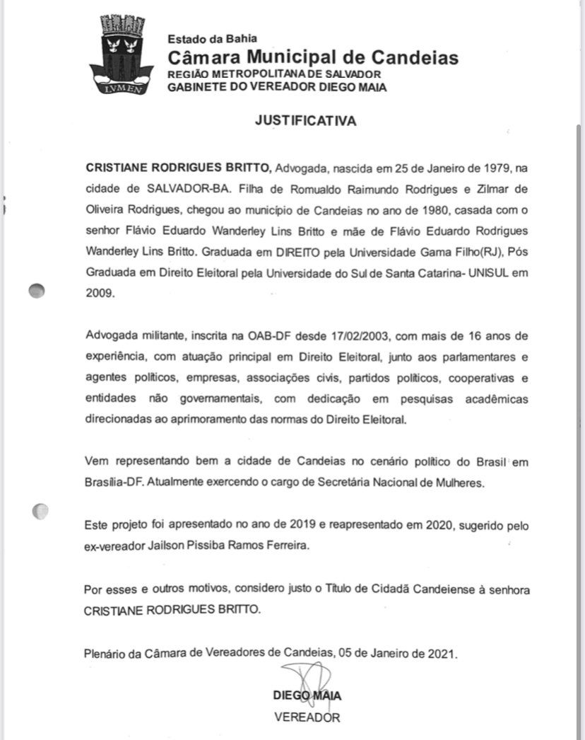 O ato solene ocorre às 09h00 da manhã e será transmitido pela TV Câmara no Facebook da CMC. Logo após a sessão, a Ministra participa às 13h do programa Baiana Livre, na rádio Baiana FM 89,3 Cristiane Rodrigues Britto é advogada, nascida em Salvador, filha de Romualdo Raimundo Rodrigues e Zilmar de Oliveira Rodrigues, chegou em Candeias em 1980, casada com o Sr. Flávio Britto e é mãe de Flávio Britto. Graduada em direito pela Universidade Gama Filho no Rio de Janeiro, pós graduada em Direito Eleitoral pela Universidade do Sul de Santa Catarina, em 2009. Advogada com mais de 16 anos de experiência, Cristiane na advocacia, tem uma forte atuação no Direito Eleitoral, sendo uma das mais renomadas advogadas em sua área. Em 2019, assumiu a importante missão de ser a secretaria Nacional de Políticas para Mulheres. Em 2022, no dia 30 de março, assumiu como Ministra da Mulher, da Família e dos Direitos Humanos. Esta é a primeira vez em que um ministro de Estado recebe a maior honraria concedida pelo município de Candeias